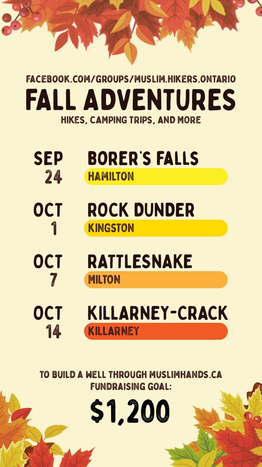Fall of 2023, we ran a campaign to raise funds to build a well through MuslimHands charity. We ran 5+ hikes, and raised a total of $1,200 dollars for this cause. Thanks to all the generous donors, we were able to meet this goal within the month.